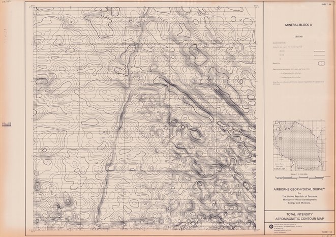 Title: Airborne Geophysical Survey for The United Republic of Tanzania, Ministry of Water, Energy and Minerals, Total Intensity Aeromagnetic Contour map - Scale: 100000 - Sheet number/Numéro de feuille/Bladnummer: 94