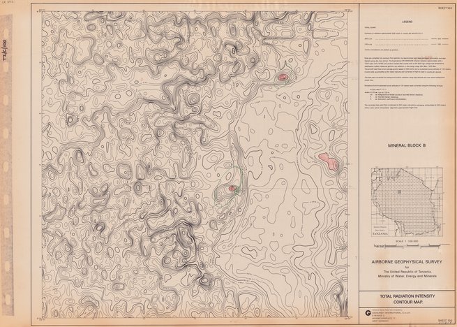 Title: Airborne Geophysical Survey for The United Republic of Tanzania, Ministry of Water, Energy and Minerals, Total radiation Intensity Contour map - Scale: 100000 - Minute - Sheet number/Numéro de feuille/Bladnummer: 100