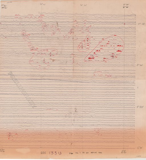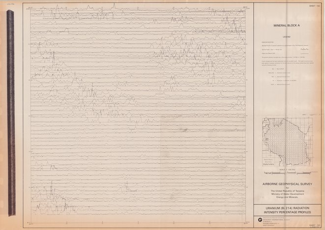 Title: Airbone Geophysical Survey for The United Republic of Tanzania Ministry of Water, Energy and Minerals, Uranium (Bi 214) radiation Intensity profiles - Scale: 100000 - Preliminary Minute - Sheet number/Numéro de feuille/Bladnummer: 133