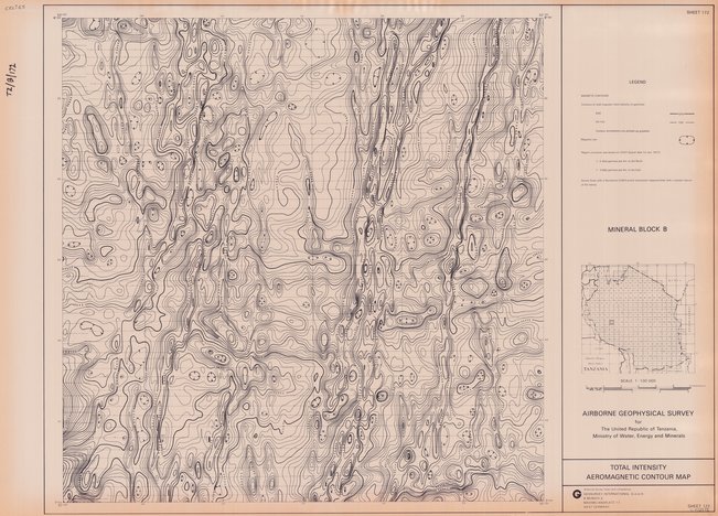 Title: Airborne Geophysical Survey for The United Republic of Tanzania, Ministry of Water, Energy and Minerals, Total Intensity Aeromagnetic Contour map - Scale: 100000 - Sheet number/Numéro de feuille/Bladnummer: 172