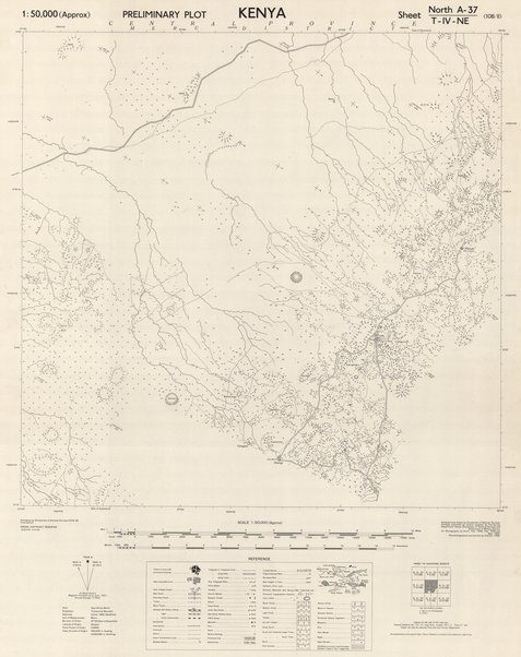 Cette carte renseigne sur l'emplacement des infrastructures privées et étatiques (hôpitaux, églises, écoles...), les réserves naturelles, les forêts, les agglomérations, les mines, les cratères, etc. dans une partie du Kenya vers les années 1953.