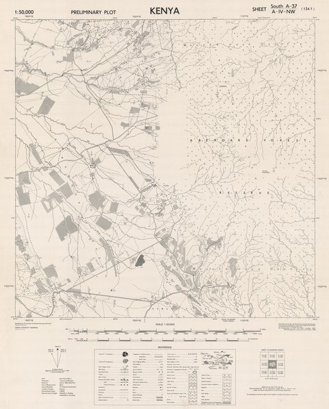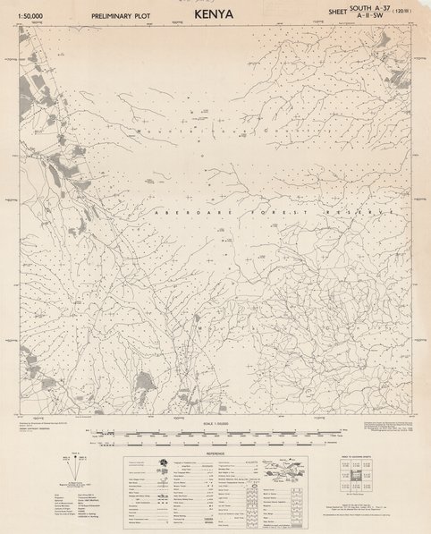 Cette carte localise les infrastructures, les routes, les localités, les différentes forêts, les agglomérations dans une partie du Kenya vers les années 1953.